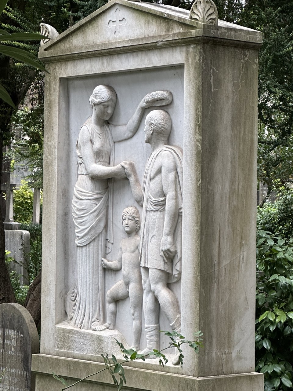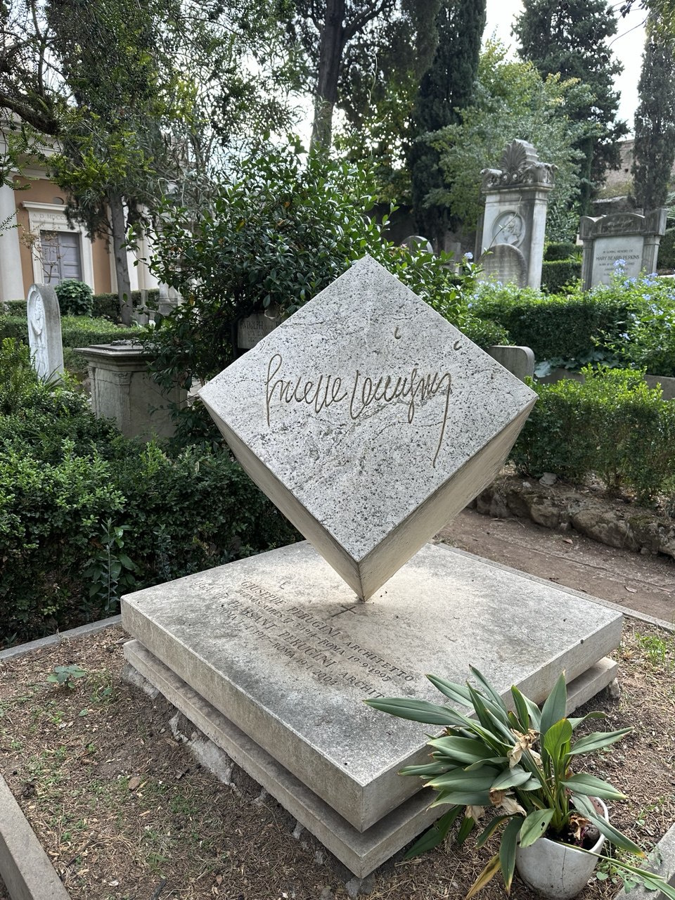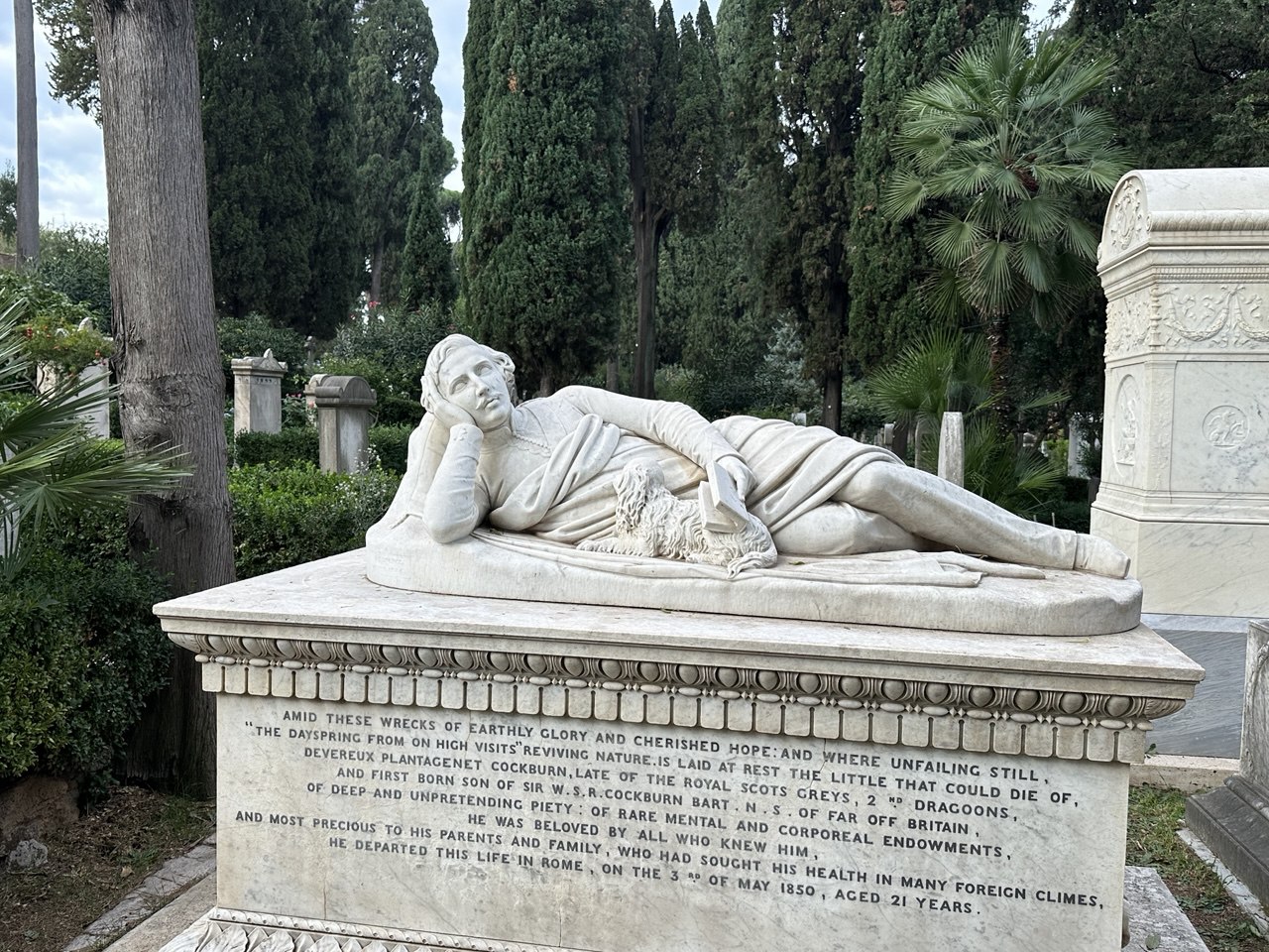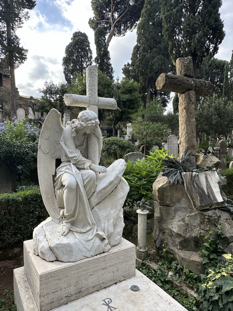 Среди скульптур особенно выделяется та, которую американский скульптор и поэт Уильям Стори создал на смерть возлюбленной Эмелин (они оба похоронены на этом кладбище): отчаянный ангел, упавший на могилу, очень хорошо передает идею человеческих страданий скульптора — смерть его жены. Воплощение печальной бренности бытия — могила английского поэта Джона Китса, который умер в Риме от туберкулеза всего в 25 лет: на ней нет украшений, оборок, имен, только надпись: «Здесь лежит человек, имя которого написано на воде».